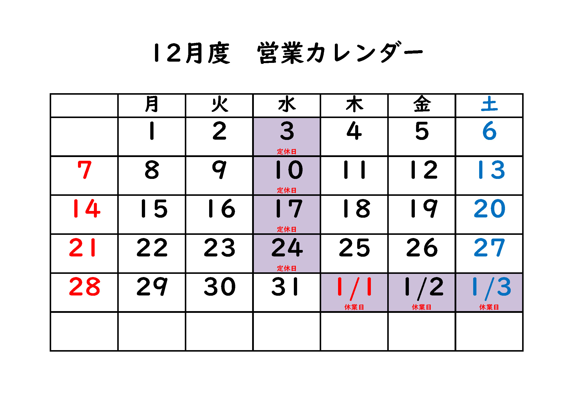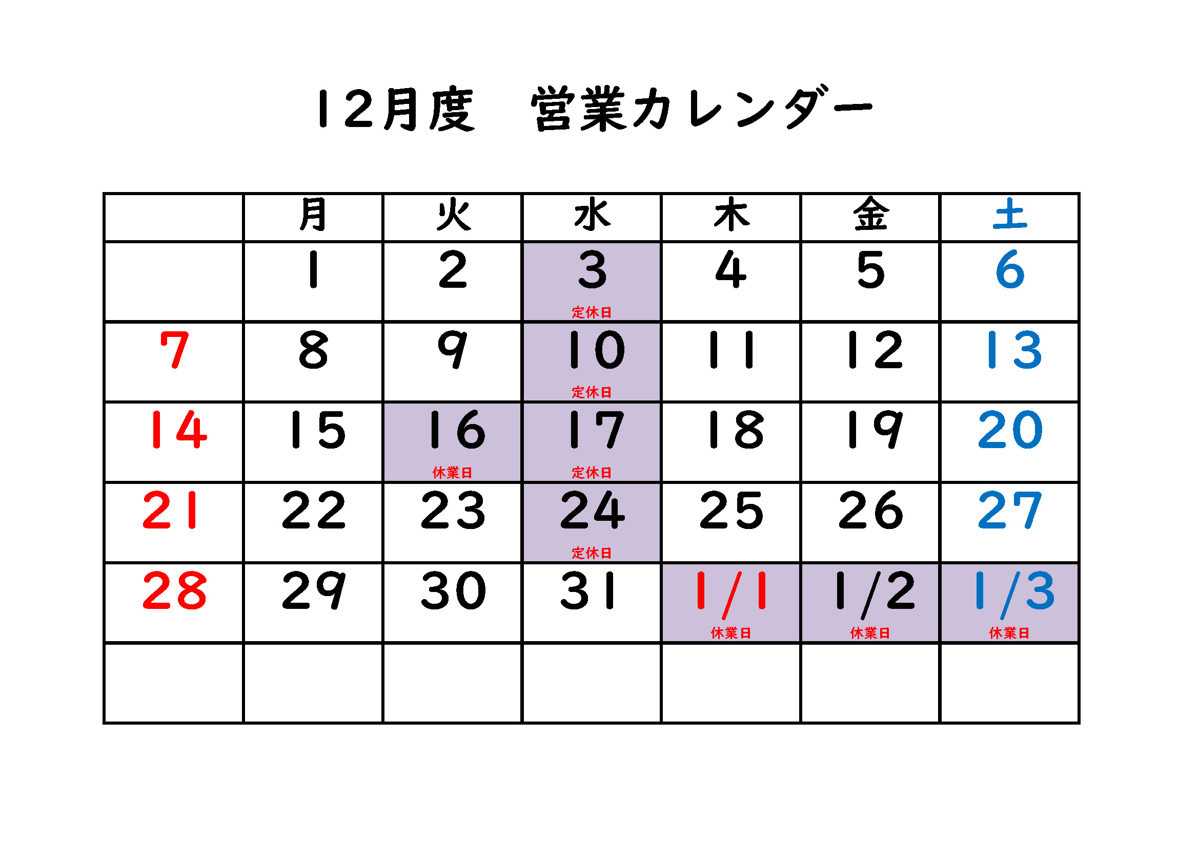 12月の営業カレンダーのお知らせです。